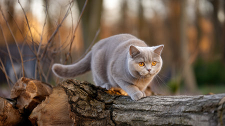 A beautiful gray cat elegantly walks across a log in a serene outdoor setting, with soft golden sunlight illuminating its striking features and curious eyes.