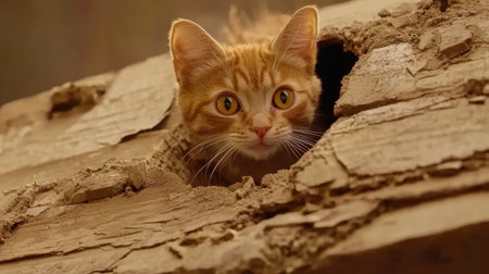 A charming ginger cat peeks through a weathered wooden plank, its expressive eyes filled with curiosity and surprise, embodying the playful spirit of nature.