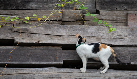 Cat on the old wooden wall, vintage style, selective focus.