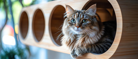 A fluffy cat lounging inside a wooden structure with circular openings, looking content