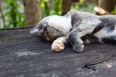 Cat sleepingon wood table in the garden