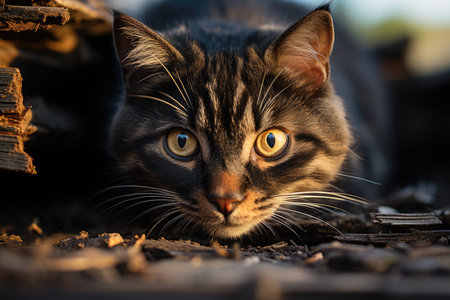Portrait of a cat outdoors in spring. The cat lying on logs in the yard on a sunny day