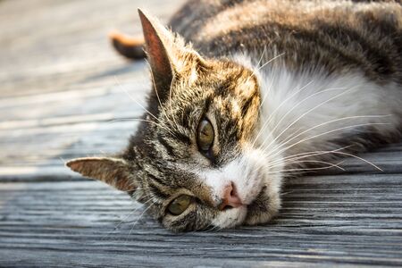 Cute ginger cat lying on the wooden floor in the garden.
