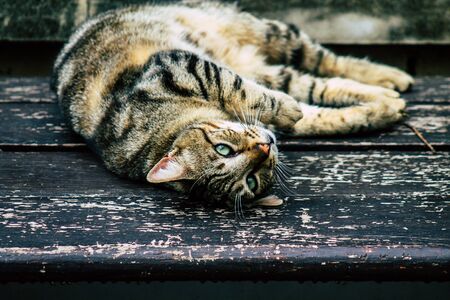 Beautiful domestic cat lying and relaxing on a wooden chair in the late afternoon sun