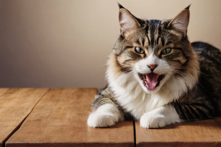 A cat is sitting on a wooden table and making a loud noise. The cat has a very expressive face, with its mouth open and its eyes wide. The scene is playful and lighthearted