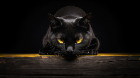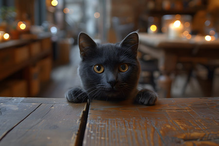 A black cat peers over a rustic wooden table in a cozy coffee shop, with bokeh lighting creating a warm and inviting atmosphere in the background. the scene charm of feline curiosity and the comfort of a cafe setting, ideal for pet and lifestyle themes. Generative AI