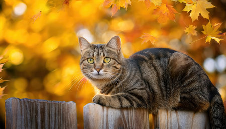 A playful tabby cat lounges on a rustic fence amid vibrant autumn leaves.