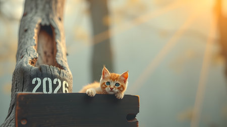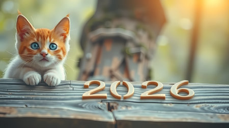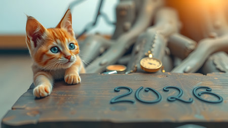 The cat amidst festive holiday decor with red knitted numbers. merry christmas and Happy 2026 new Year. AI generated
