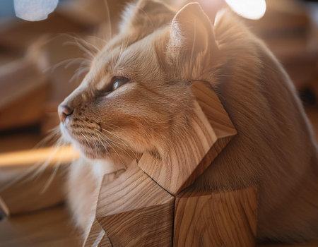 A calico cat lies on a wooden table gazing thoughtfully as soft light illuminates its fur. The setting is tranquil and cozy.