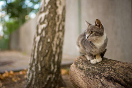cute grey kitty sitting in the summer garden on the tree trunk