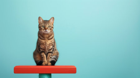 Brown tabby cat sits attentively on top of red perch against soft blue background