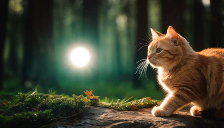 Cute ginger cat sitting on a log in a forest at sunset.