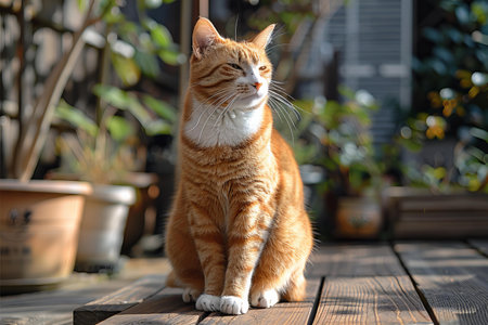 An orange and white cat sitting on a wood deck, high quality, high resolution