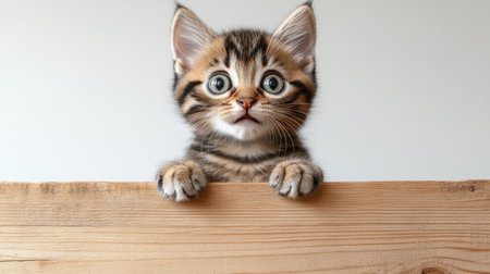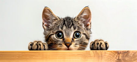 Adorable tabby kitten with wide eyes peeking over a wooden edge against a white background