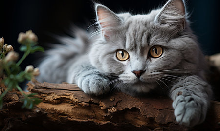 AI Generated. Curious Cat with Big Eyes Staring in Front of Wooden Background