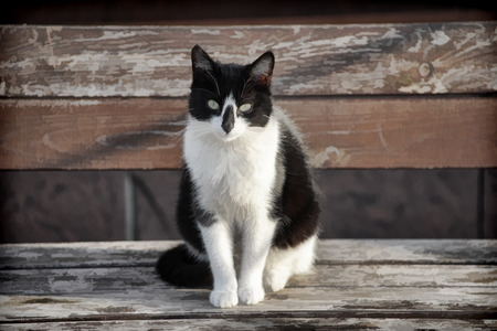Black and white cat sitting on a wooden bench.