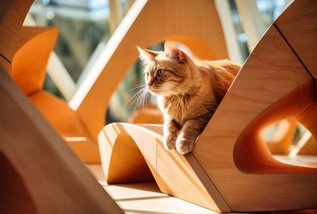 An AI generated illustration of a small orange cat on a wooden shelf