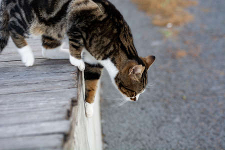 young playful tabby white domestic shorthair cat jumping over a piece of wood looking focused with wide pupils