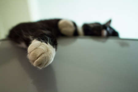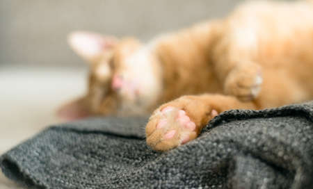 Close up of sleeping cat paws to show concept of a cozy home, staying home with pets and coping with home quarantine due to the covid-19 pandemic