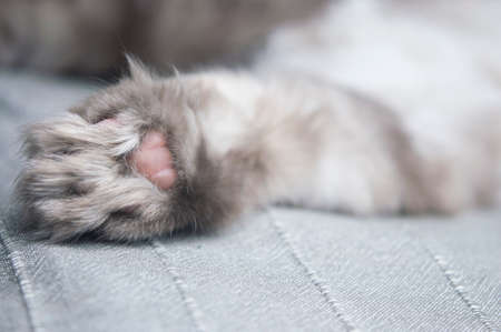 Close-up of fluffy paws of silver or grey scottish fold cat. High quality horizontal banner. Domestic animal theme