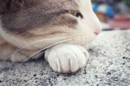 Close-up photo of cats paw, white cat’s paw stepped on a stone