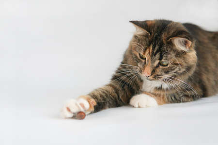 Fluffy paw of a white cat on a white background. Atmospheric photo of comfort and warmth