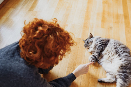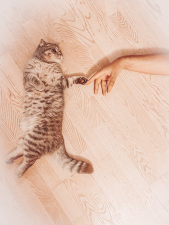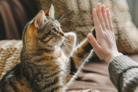 Cute smart cat giving high five to owners hand