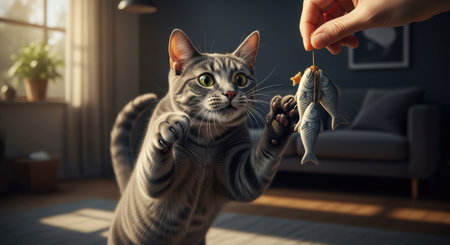 A happy cat jumping to catch a dangling toy, its paws extended and eyes full of concentration in a bright, cozy room.