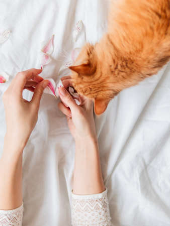 Top view on ginger cat sniffing woman's hands with pink flower petals. Fluffy pet and pet owner crumpled white textile background.
