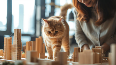 Wooden Skyscraper Model Construction with Friendly Office Cat