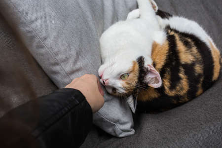 Hand of person stroking a cat lying on the sofa cute