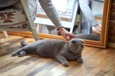 Scottish Fold domestic cat at home. Hand petting.