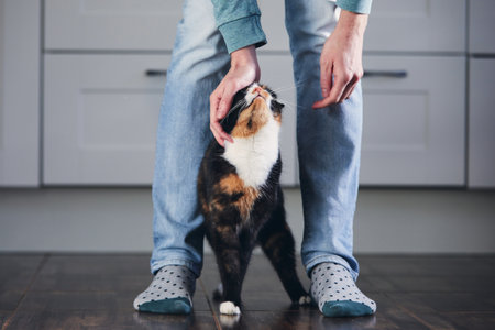 Domestic life with pet. Man stroking his mottled cat in home kitchen.