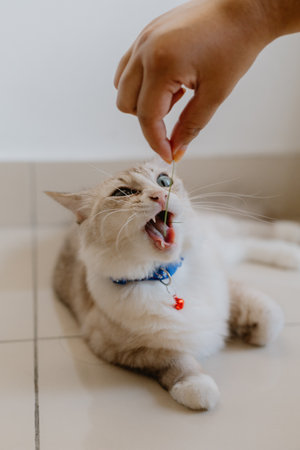 Cat enjoys a treat given by a person in a cozy indoor setting
