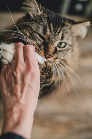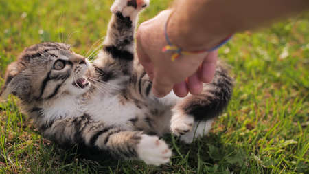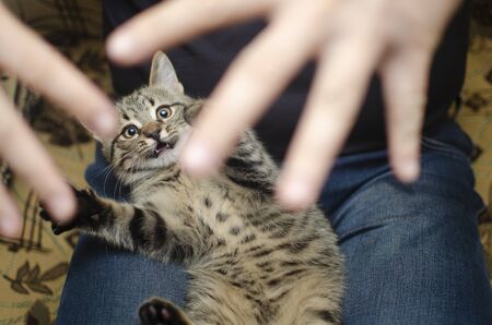striped kitten plays with the hands of a man, lies on the man’s lap, ready to bite with fangs, soft focus