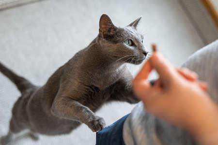 Hungry Russian blue cat begs for treats