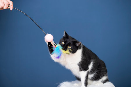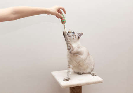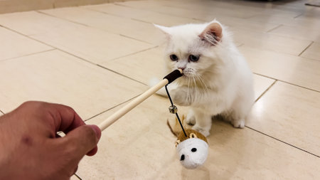 Funny cat playing with mouse toy held by woman hand