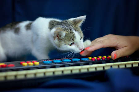 Portrait of white tabby cat standing on piano on blue background.