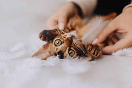 adorable abyssinian kitten lying upside down indoors