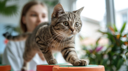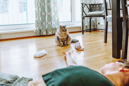 Playful Tabby Cat Enjoys Interactive Fun with Colorful Toys and Owner on a Cozy Carpet.