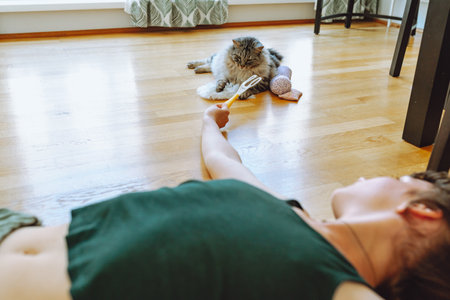 cat and teenager lying on floor at home