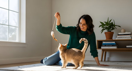A smiling woman sits on a rug in a bright living room, playing with a ginger cat using a feather wand toy. The playful interaction highlights the bond between pet and owner in a modern, comfortable home setting.