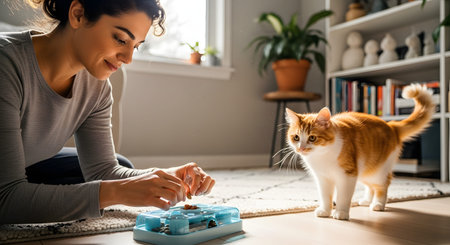 A smiling woman fills a blue interactive food puzzle toy with kibble for her ginger and white cat. The cat watches intently in a modern living room setting.