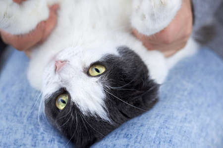 A woman is holding the paws of her cat, which is lying on her lap, the theme of friendship with pets.