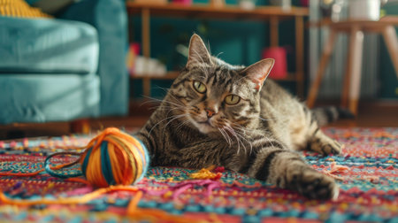 An overweight cat looking joyful while playing with a ball of yarn on a colorful rug in a vibrant living room