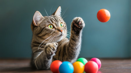 A cat playing with a set of colorful toy balls, tossing them around and having a great time with its toys.