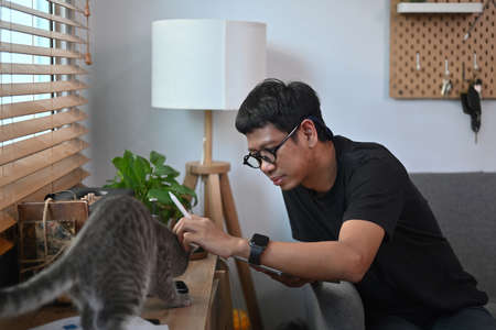 Young asian man playing with his cute cat in living room.
