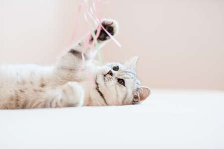 Domestic striped cat lies on a floor and plays with a toy.