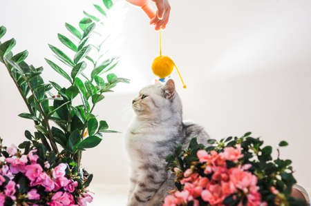 young blonde woman having fun playing with her white cat that catches a cats toy with claws