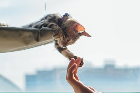 Cute little bengal kitty cat laying on the cat's window bed toching man's hand with it's paw. Sunny seat for cat on the window. Copy space.